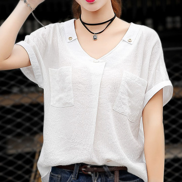 2016夏季新款休閑短袖紅色上衣v領顯瘦雪紡襯衫女 /