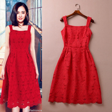 2016春夏新款楊冪明星同款紅色蕾絲吊帶無袖中長款連衣裙 /