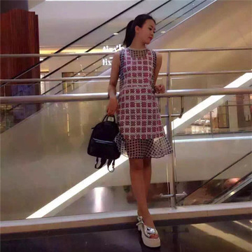 2016夏裝新款甜美百搭格子印花拼接荷葉邊圓領(lǐng)無(wú)袖連衣裙3M2O340 /