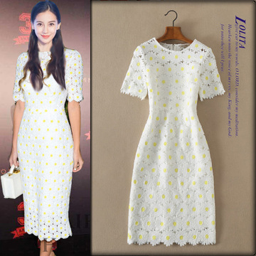 汐檸女裝2016新款女裝明星同款歐美時(shí)尚蕾絲刺繡菊花修身短袖連衣裙潮 /