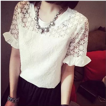 2016蝴蝶結(jié)夏季甜美鏤空蕾絲衫女裝白色雪紡短袖上衣 /