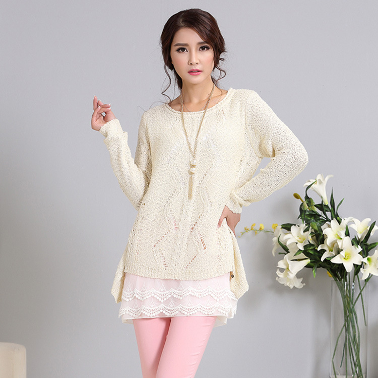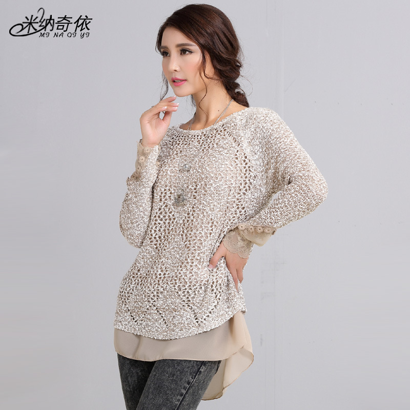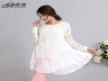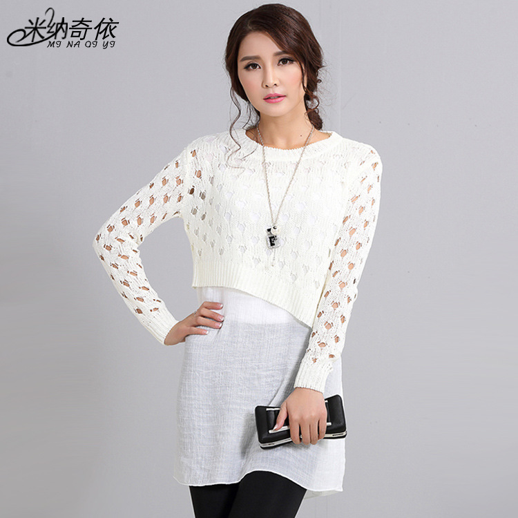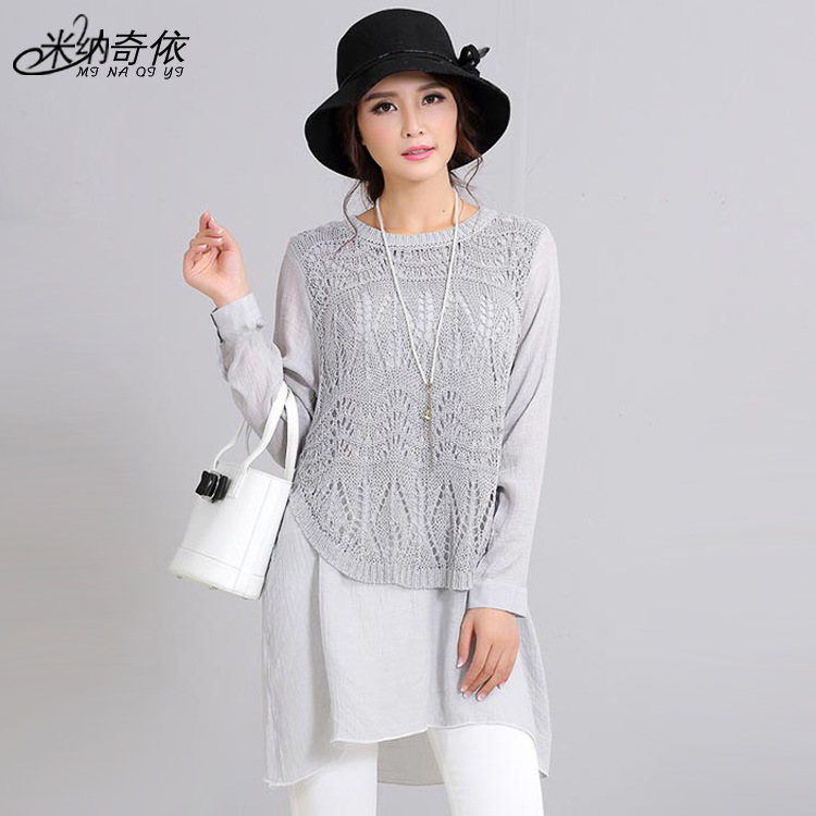 2015秋裝新款文藝小清新棉麻拼接女式針織衫 假兩件套中長款毛衣 /