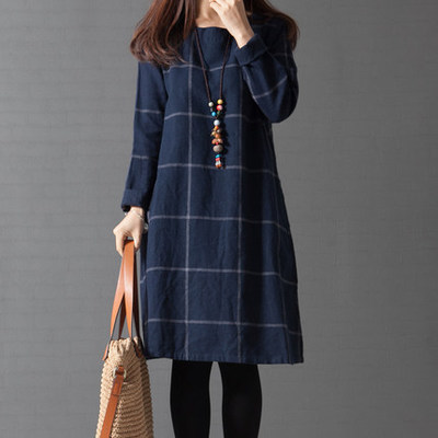 2015秋裝新款 文藝大碼女裝寬松 韓版長袖格子棉麻連衣裙女 /