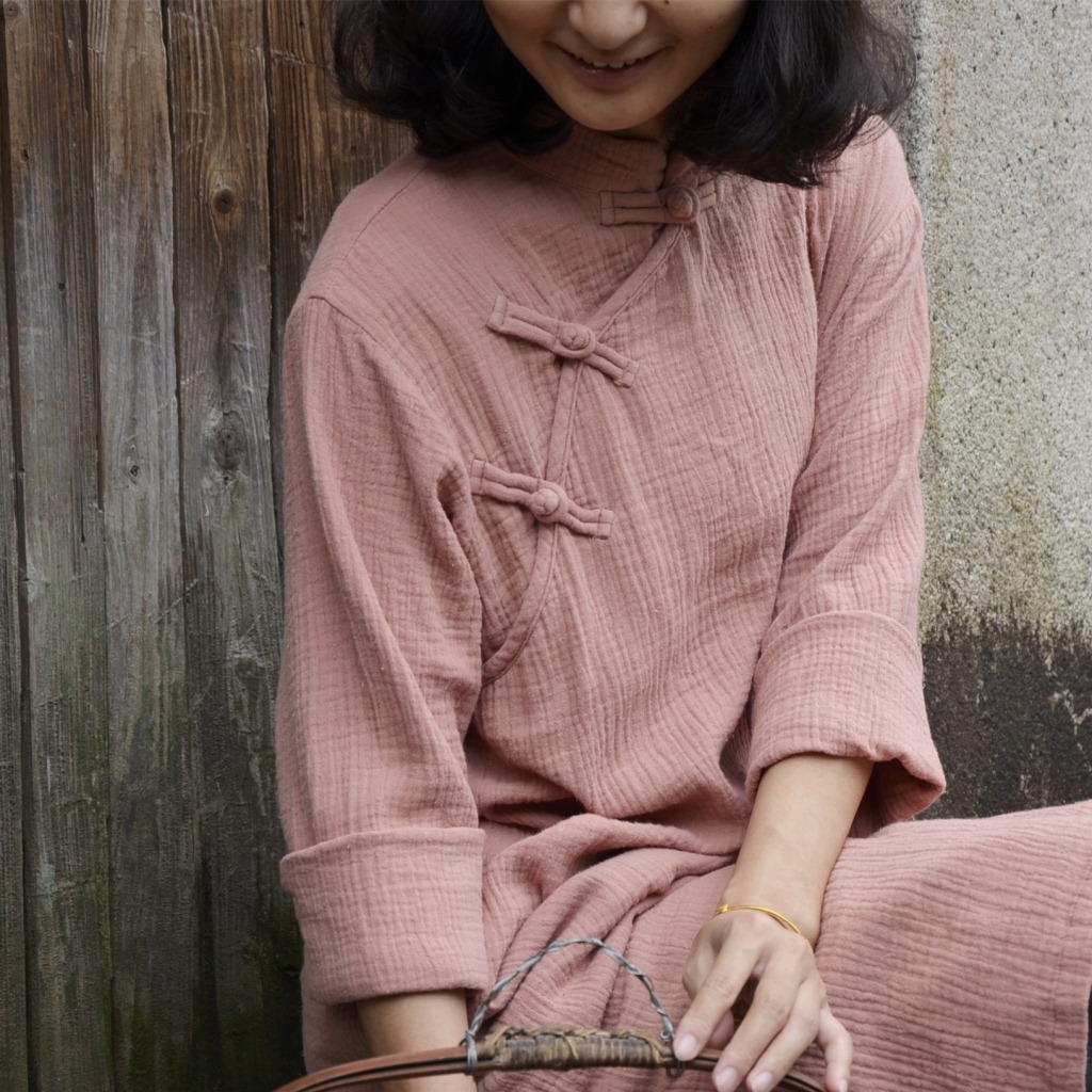 復(fù)古旗袍中式民國(guó)文藝懷舊風(fēng)盤扣斜門襟套頭下擺開叉純色袍子長(zhǎng)袖 /