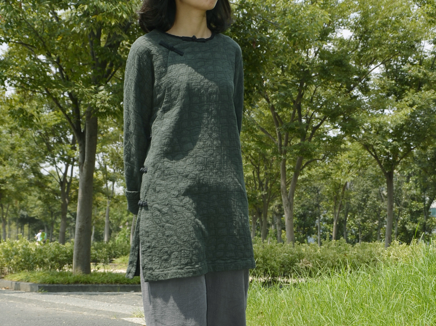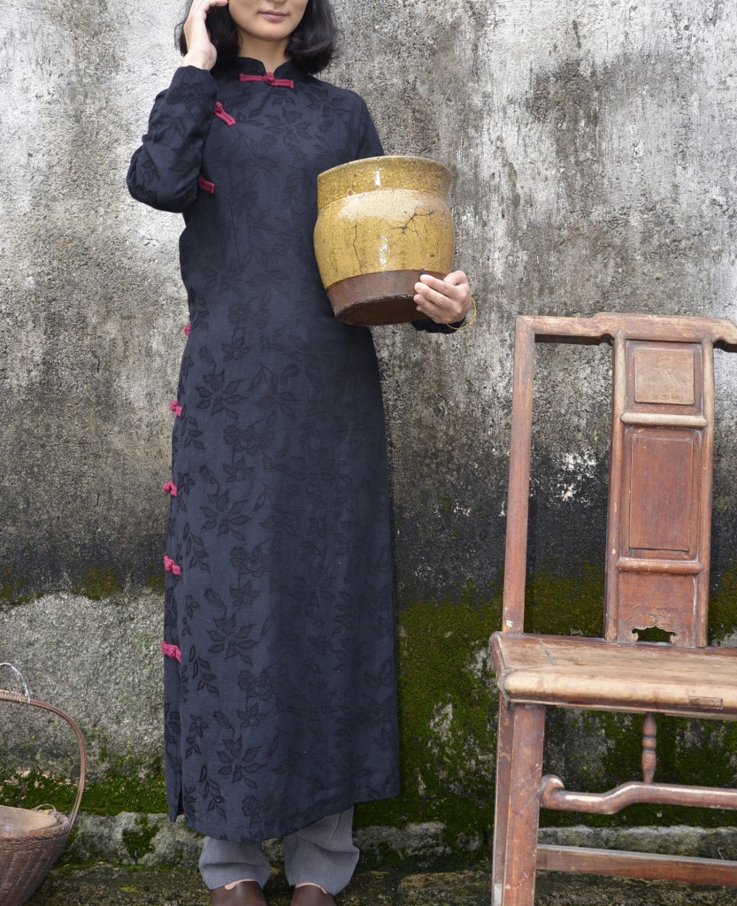 原創(chuàng)復(fù)古棉麻提花長(zhǎng)款色盤扣撞色長(zhǎng)袖改良版旗袍連衣裙非常優(yōu)雅 /