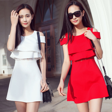 歐洲站2016夏季新款女裝韓版收腰露肩修身顯瘦淑女A字裙連衣裙 /