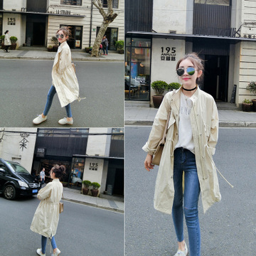 R21#2016夏季新款 韓版抽繩收腰立領中長款風衣 寬松顯瘦長袖外套 /