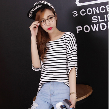 實(shí)拍現(xiàn)貨2016夏裝新款純棉條紋T恤時(shí)尚寬松休閑五分短袖潮 /