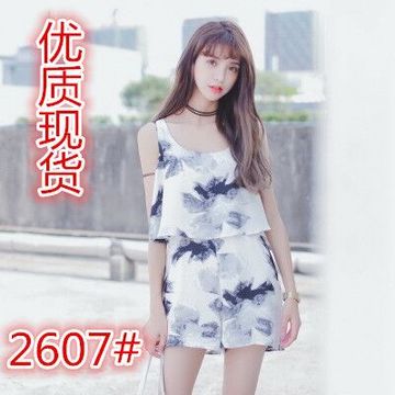2016夏新款水墨印花休閑吊帶無袖背心碎花連體褲闊腿短褲 /