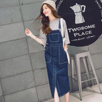 春新款女裝韓版寬松口袋無(wú)袖牛仔連衣裙前開(kāi)叉牛仔背帶裙 /