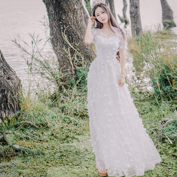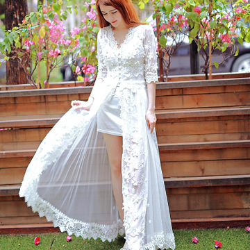 淘寶網(wǎng)店代銷(xiāo)開(kāi)叉立體繡花白色蕾絲網(wǎng)紗連衣女長(zhǎng)裙兩件套一件代發(fā) /