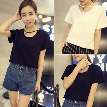 2016夏裝新款韓版時(shí)尚簡約寬松鏤空流蘇裝飾圓領(lǐng)純色短袖T恤女潮 /