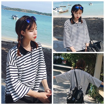 2016新款韓版春夏季時(shí)尚百搭新勢(shì)力新品條紋中袖T恤女潮 /