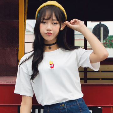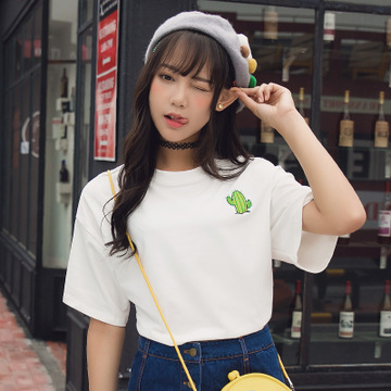 2016夏季女學(xué)生新款T恤刺繡BF風(fēng)寬松上衣白 /
