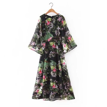 2016歐美風春夏女裝新款批發(fā)花色喇叭袖連衣裙 /