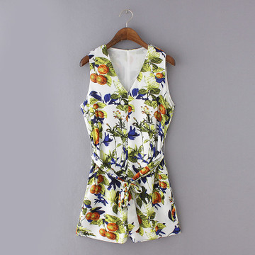 2016歐美風春夏女裝新款批發(fā)印花V領(lǐng)系腰帶連體短褲 /