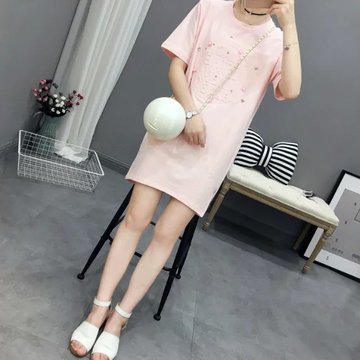 韓國東大門2016韓版立體字母壓花釘珠圓領(lǐng)中長款短袖T恤連衣裙女 /
