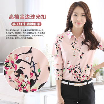碎花襯衫女長袖粉色OL修身顯瘦大碼春職業(yè)打底衫百搭印花雪紡衫 /