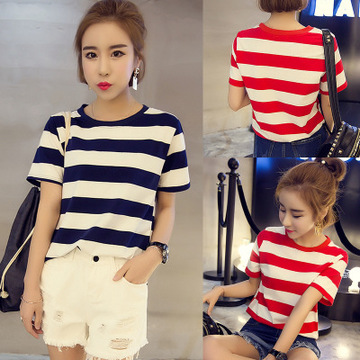 2016春裝新款韓版寬松顯瘦上衣圓領(lǐng)橫條紋短袖T恤衫 /