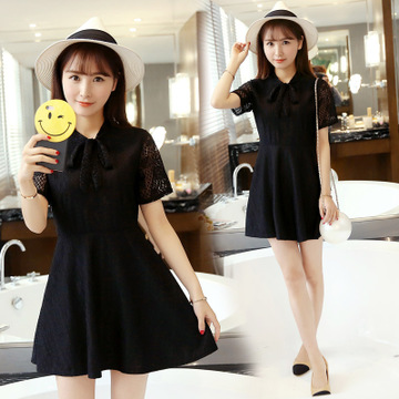 實(shí)拍現(xiàn)貨春夏裝新款韓版收腰顯瘦花邊領(lǐng)純色蕾絲短袖連衣裙 /