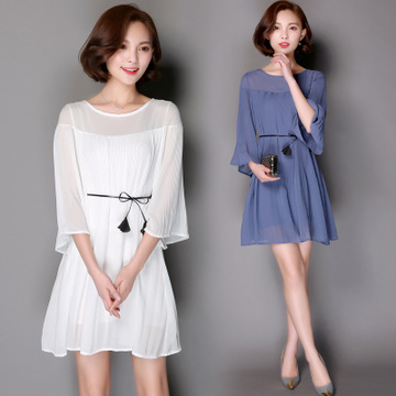 實(shí)拍雪紡連衣裙女夏季新款韓版a字短裙九分喇叭袖高腰裙子 /