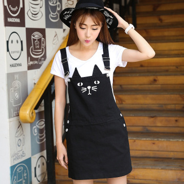 新款韓版印花牛仔裙 貓咪耳朵黑色牛仔背帶裙女 韓版背帶短裙黑色 /