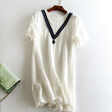 TK33-甜美喇叭袖~V字條鑲邊流蘇墜~韓國東大門熱銷款 棉麻連衣裙 /