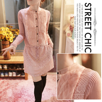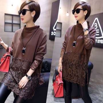 新款高領(lǐng)寬松打底女韓版蕾絲拼接長袖連衣裙 /