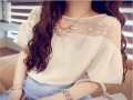 2016夏季新款甜美波點(diǎn)蕾絲拼接寬松百搭時(shí)尚雪紡衫短袖女裝批發(fā) /