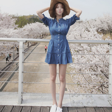 韓國(guó)東大門五分袖高腰水洗薄牛仔裙收腰連衣裙春夏女士裙子 /