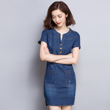 實拍2016夏韓版短袖牛仔連衣裙女寬松大碼A字裙v領薄款裙子潮 /