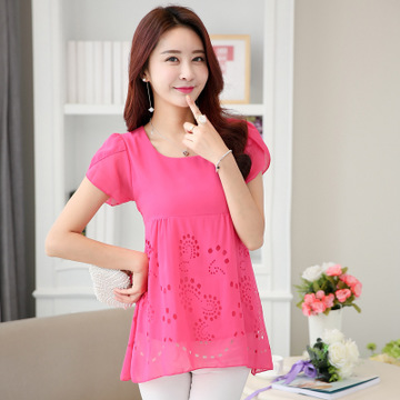 夏裝燒花鏤空新款韓版潮中長款修身大碼短袖雪紡衫 女 上衣 /