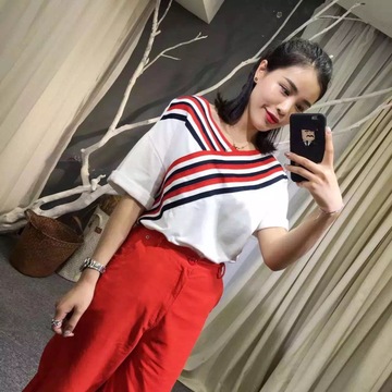 新款條紋拼接可當一字肩穿短袖T恤女裝批發(fā)招微商代理代發(fā) /