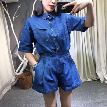 新款超級顯瘦松緊腰頭不挑人穿的牛仔襯衫短褲牛仔套裝女 /
