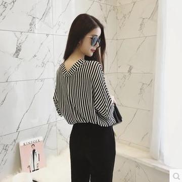 H新款韓版女裝V領(lǐng)豎條波點打底衫中袖雪紡衫寬松大碼襯衫女潮 /
