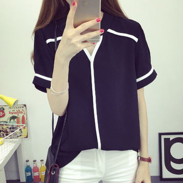實拍 2016夏裝新款韓版T恤雪紡衫女寬松顯瘦純色短袖襯衫 /
