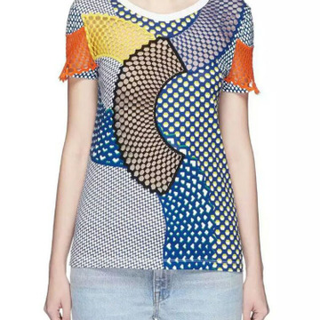 拼色波點網(wǎng)格網(wǎng)面混合印花透明女短袖 女士網(wǎng)紗混紡紗棉針織T恤 /