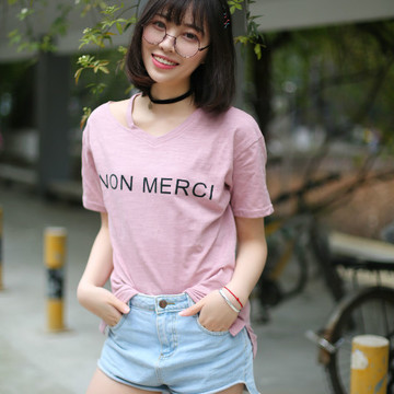 2016夏季新款休閑T恤小清新斜肩帶字母短袖寬松上衣女# /
