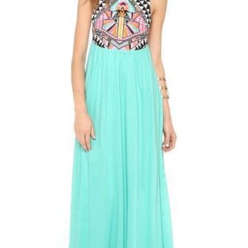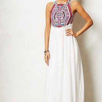 歐洲夏裝新款時(shí)尚民族風(fēng)印花拼接純色拖地吊帶T臺(tái)秀長(zhǎng)裙 /