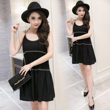 2016夏季新款韓版女裝性感重工鏈條掛脖吊帶 必備A字百褶連衣裙 /