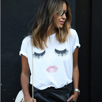 速賣通eaby 睫毛+紅唇時尚落肩卷袖歐美爆款印花T恤901 /