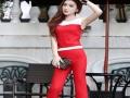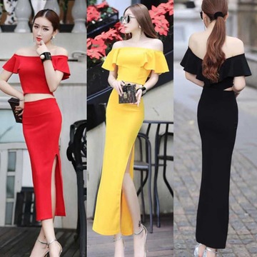 新款歐美性感露腰一字領(lǐng)荷葉邊上衣開叉包臀半身裙 套裝 /
