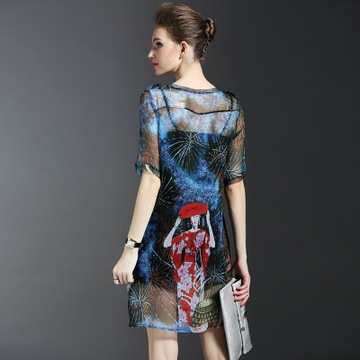 夏裝新款女2016歐美時(shí)尚中袖修身兩件套真絲印花連衣裙 /