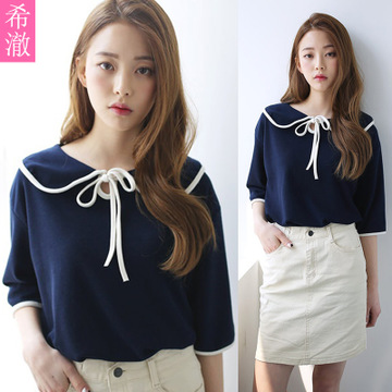2016夏季韓版新品時(shí)尚系領(lǐng)學(xué)院風(fēng)純棉T恤女百搭顯瘦海軍領(lǐng)上衣潮 /