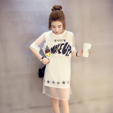 小穎家 2016夏裝新款韓版寬松中長(zhǎng)款圓領(lǐng)短袖印花字母雙層百搭T恤 /