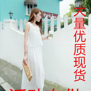 春夏裝新款立體蕾絲花朵背心假兩件連衣裙長(zhǎng)裙雪紡松緊腰沙灘裙女 /
