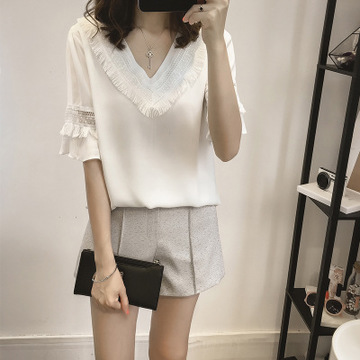 流蘇拼接中袖雪紡衫女 夏季新款女裝甜美修身V領(lǐng)t恤上衣一件代發(fā) /