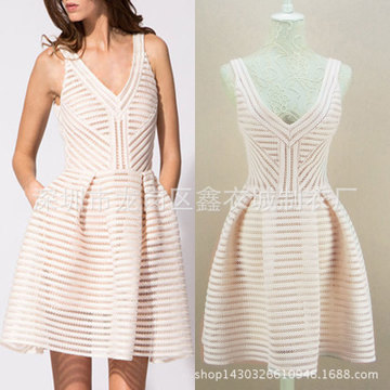 歐美潮款V領(lǐng)網(wǎng)格無袖性感露背蓬蓬裙 赫本高腰修身連衣裙 /