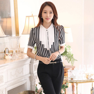 2016夏季潮流時尚條紋女式襯衫寬松立領中長款開衫短袖襯衣女 /