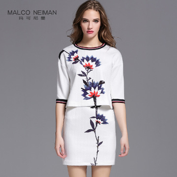 歐州站2015秋冬新款 時尚印花釘珠太空棉七分袖短裙兩件套裝代發(fā) /